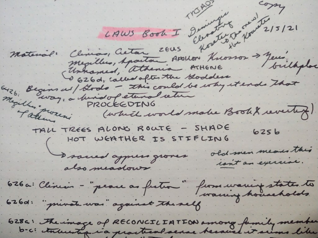 On Thursday, I switched inks in my main TWSBI for the first time in years. While I flushed the barrel, watching the J. Herbin Poussière de Lune dissipate into the purified water, deceptively dark but absolutely transparent the first few times I pumped the pen, I thought through my superstitions about the switch to the plain black Parker Quink and my craving for that flat absence of color on the sheets of paper. The first few inches of notes I’ve taken on Book I of the Laws (which I am rereading) are in dark purple. As I progressed, the notes switched to black abruptly, and then the two intermingled with one another as I went back to the beginning and filled in additional bits about the characters on my sheet of paper. Above it were notes on how to construct prayers to all of the Gods, also in purple.