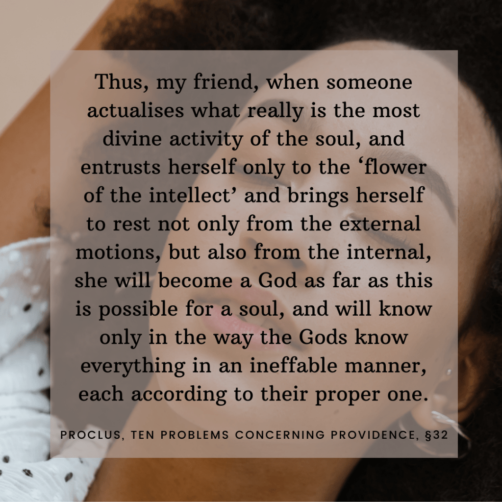 This is something beautiful that Proclus wrote in Ten Problems Concerning Providence about the soul and the flower of the intellect. It’s a nice perspective shift from the earlier two, which are about the moderation of the tongue and body. As a heads up, there are a few minor modifications in a few of these quotations for particularity; while I hope others enjoy them and repost if so inspired, I ultimately made them for me to flip through.