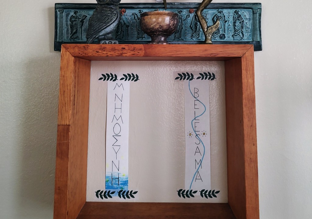 When I don’t have it in my budget, or if I just don’t like any of the icons out there, or when I don’t have the space, or when I don’t worship a God enough to investigate a more intricate icon, I use the names of Gods instead. As I have mentioned before on this blog, I came up with this very early on in my adulthood based on reading that names inscribed on sacrificial altars were extremely important for signaling who the sacrifice was for. In my youth, it was harder to find agalmata in the United States, and especially at my college-student-followed-by-recent-grad price point, so I wrote Gods’ names on clean popsicle sticks with colorful pens that I found around the home. Briefly after I shared this on my old blog, someone who liked the idea was selling something similar on Etsy, which was nice, as it made me feel useful. People are welcome to take this concept and do what they like with it, to be honest. I’m not an artisan. I’ve thought about commissioning wood-burnt name sticks eventually because they’re less prone to water bleeding.