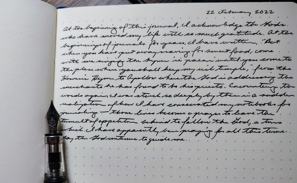 It’s from the long Homeric Hymn to Apollon, and the God is addressing the sailors he has brought to Delphi. Reflexively, thoughts raced through my mind — analysis. Sweet food, the delights of the sensory and the irrational world; the hymn ie paean, the rites and rituals we keep for the God; the upward climb following the God to the temple; the inevitable journey into the adytum. How long had I written that passage down? How many years had I spent thinking of those words without realizing the selection of them was a prayer, not knowing what putting down those specific words meant? I thought back to that one time I prayed to Durga in my teens, and it was momentarily amusing that I had prayed to Apollon with the same ignorance. I felt such gratitude that the God had answered, though. I wrote out the words. My fountain pen made a hollow sound against the hard inner cover while my mind peppered the interior stream-of-consciousness with images of difficult upward trails, the sound of a lyre, and a sense of inner steadiness. I started off my journal in 2016 venting about a work thing. I started off my journal on February 22, 2022, expressing gratitude to Apollon.