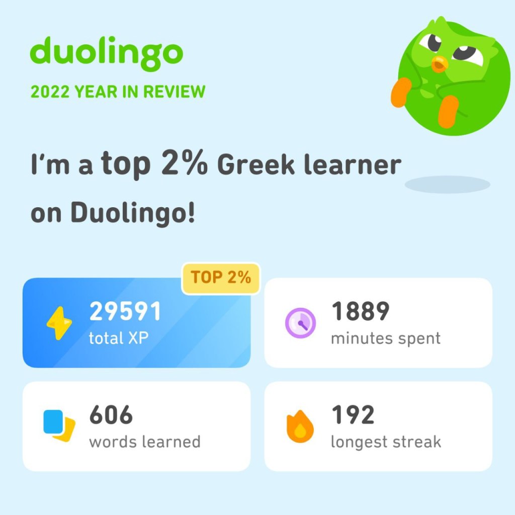 Duolingo Greek is also going well. I’m apparently a “Galactic Legend” — the app has congratulated me on being involved and supporting the co-learners I know with encouragement. My hope in 2023 is to finish all of the Greek modules, and I’ll reward myself by either getting a tutor or joining a (probably virtual) adult learning class.