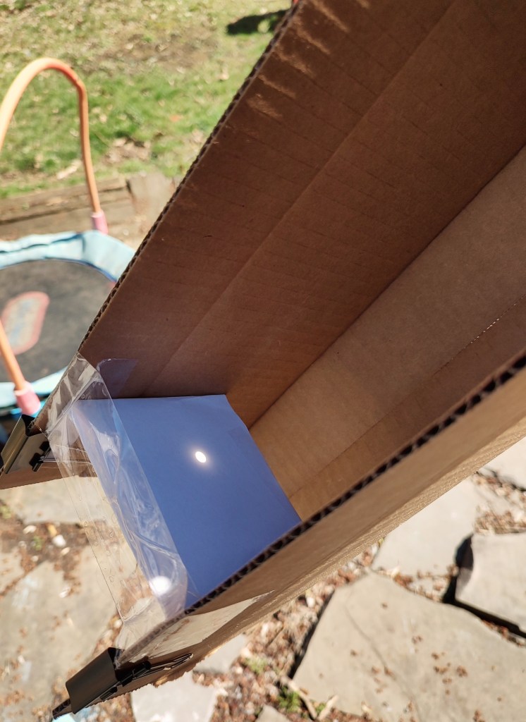 She was fighting through the vague instructions for the solar viewers that one of her acquaintances had shared online, originally from someone with a background in something optics-related. We had popped the lenses out of +1.50 reading glasses. She was in the process of figuring out the tubing part with the long, thin cardboard box. The lens would project an image of the sun onto a back panel, much like how the eye works.